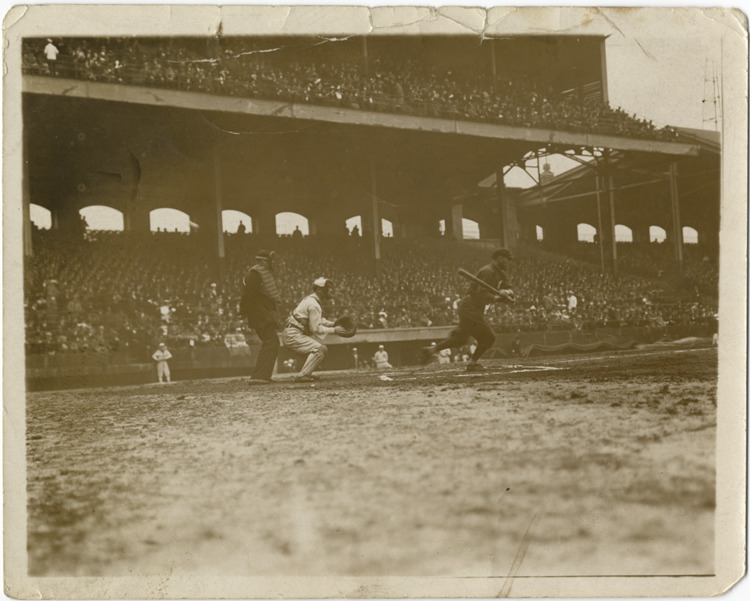 Favorite this☆ Baseball player at bat Description: View of baseball player at bat with catcher and umpire standing behind plate; crowd fills grandstand in background. Details Resource ID: hr002114 Subject: Baseball players Batting (Baseball) Catchers (Baseball) Baseball umpires Photographic prints Date Issued: Unknown year Format: 1 photographic print ; 4 x 5 in. Member of: Ernie Harwell Sports Collection Filing Location: Photographs-Action-Batting Rights: Physical rights are retained by DPL. Copyright is retained in accordance with U.S. copyright laws.