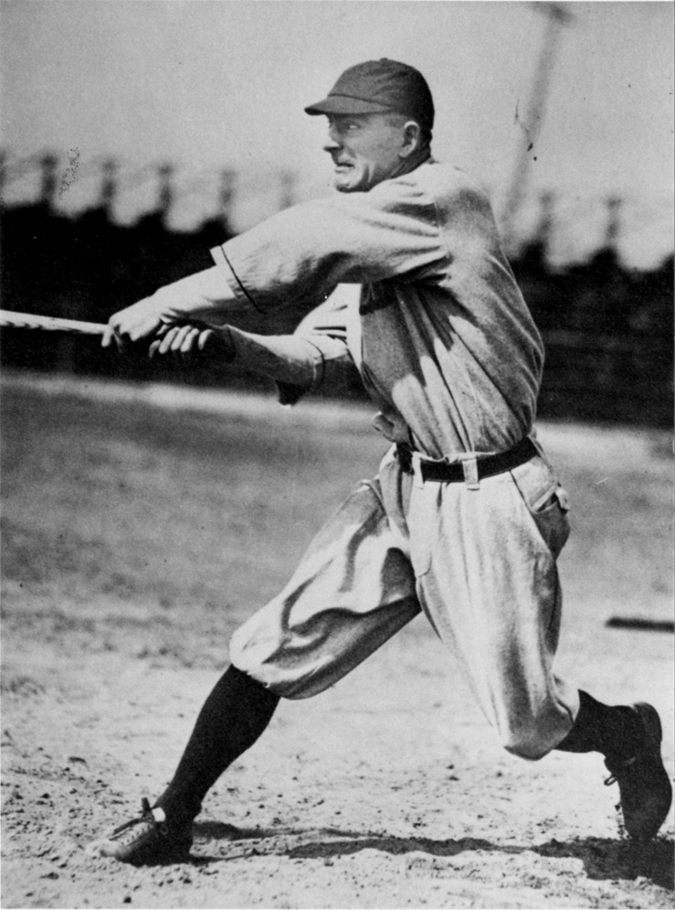 View of baseball player Bobby Veach swinging a baseball bat; Veach wears a Detroit Tigers uniform. Handwritten on back: "Bobby Veach, Det."