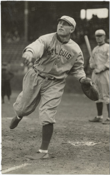 View of Sam Agnew, baseball player for the St. Louis Browns; player holding baseball bat stands in background. Handwritten on back: "Sam Agnew, Browns, 1913."
