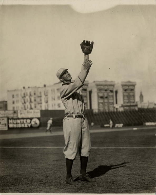 View of baseball player reaching for a fly ball; fence and buildings in background.