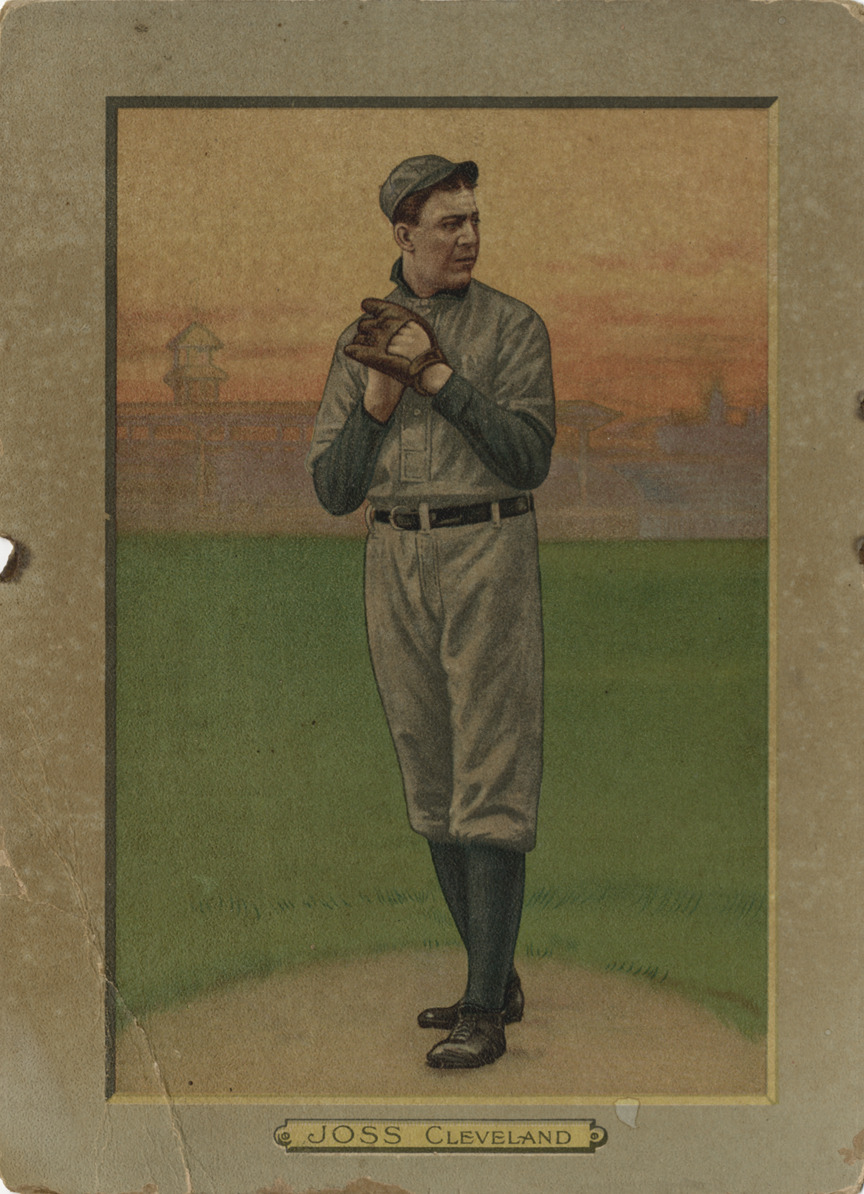 Portrait of Addie Joss, pitcher for the Cleveland Naps. Turkey Red Cabinets (T3) series. Printed on front: "Joss, Cleveland." Printed on back: "No. 19, prominent baseball players & athletes, order by number only. 1. M. Brown, Chicago, Nat'l; 2. Bergen, Brooklyn; 3. Leach, Pittsburgh; 4. Bresnahan, St. Louis Nat'l; 5. Crawford, Detroit; 6. Chase, New York American; 7. Camnitz, Pittsburgh; 9. Cobb, Detroit; 10. Devlin, New York Nat'l; 11. Dahlen, Brooklyn; 12. Donovan, Detroit; 13. Doyle, New York National; 14. Dooin, Philadelphia Nat'l; 15. Elberfeld, Washington; 16. Evers, Chicago National; 17. Griffith, Cincinnati; 18. Jennings, Detroit; 19. Joss, Cleveland; 20. Jordan, Brooklyn; 21. Kleinow, New York Amer.; 22. Krause, Philadelphia Amer.; 23. Lajoie, Cleveland; 24. Mitchell, Cincinnati; 25. M. McIntyre, Detroit; 26. McGraw, New York Nat'l; 27. Mathewson, N.Y. Nat'l; 28. H. McIntyre, Brooklyn; 29. McConnell, Boston Amer.; 30. Mullin, Detroit; 31. Magee, Philadelphia Nat'l; 32. Overall, Chicago National; 33. Pfeister, Chicago National; 34. Rucker, Brooklyn; 35. Tinker, Chicago National; 36. Speaker, Boston American; 37. Sallee, St. Louis National; 38. Stahl, Boston American; 39. Waddell, St. Louis Amer.; 40. Willis, St. Louis National; 41. Wiltse, New York National; 42. Young, Cleveland; 43. Out at third; 44. Trying to catching him nap'g; 45. Jordan and Herzog at first; 46. Safe at third; 47. Frank Chance at bat; 49. A close play at second; 50. Chief Myers at bat; 51. Jem Driscoll; 52. Abe Attell; 53. Ad. Wolgast; 54. Johnny Coulon; 55. James Jeffries; 56. Jack (Twin) Sullivan; 57. Battling Nelson; 58. Packey McFarland; 59. Tommy Murphy; 60. Owen Moran; 61. Johnny Marto; 62. Jimmie Gardner; 63. Harry Lewis; 64. Wm. Papke; 65. Sam Langford; 66. Knock-out Brown; 67. Stanley Ketchel; 68. Joe Jeannette; 69. Leach Cross; 70. Phil. McGovern; 71. Battling Hurley; 72. Honey Mellody; 73. Al Kaufman; 74. Willie Lewis; 75. Philadelphia Jack O'Brien. Any one of the above named pictures given in exchange for 10 coupons taken from Turkey Red cigarettes or 25 coupons from either Old Mill or Fez cigarettes. Send coupons by mail or express, charges prepaid to Baseball and Athlete Picture Dept., Drawer S. Jersey City, N.J. [This] offer expires June 30, 1911."