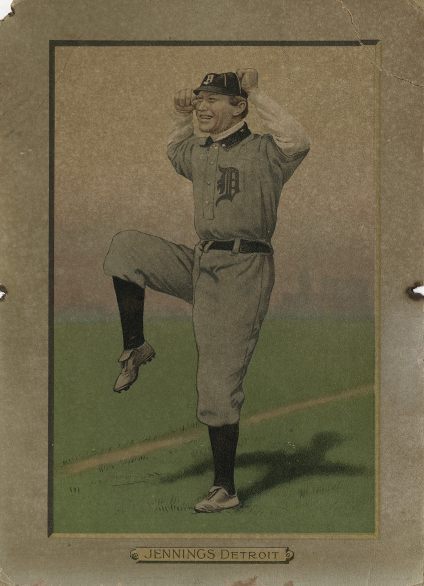Portrait of Hughie Jennings, baseball player and manager for the Detroit Tigers. Turkey Red Cabinets (T3) series. Printed on front: "Jennings, Detroit." Printed on back: "No. 18, prominent baseball players & athletes, order by number only. 1. M. Brown, Chicago, Nat'l; 2. Bergen, Brooklyn; 3. Leach, Pittsburgh; 4. Bresnahan, St. Louis Nat'l; 5. Crawford, Detroit; 6. Chase, New York American; 7. Camnitz, Pittsburgh; 9. Cobb, Detroit; 10. Devlin, New York Nat'l; 11. Dahlen, Brooklyn; 12. Donovan, Detroit; 13. Doyle, New York National; 14. Dooin, Philadelphia Nat'l; 15. Elberfeld, Washington; 16. Evers, Chicago National; 17. Griffith, Cincinnati; 18. Jennings, Detroit; 19. Joss, Cleveland; 20. Jordan, Brooklyn; 21. Kleinow, New York Amer.; 22. Krause, Philadelphia Amer.; 23. Lajoie, Cleveland; 24. Mitchell, Cincinnati; 25. M. McIntyre, Detroit; 26. McGraw, New York Nat'l; 27. Mathewson, N.Y. Nat'l; 28. H. McIntyre, Brooklyn; 29. McConnell, Boston Amer.; 30. Mullin, Detroit; 31. Magee, Philadelphia Nat'l; 32. Overall, Chicago National; 33. Pfeister, Chicago National; 34. Rucker, Brooklyn; 35. Tinker, Chicago National; 36. Speaker, Boston American; 37. Sallee, St. Louis National; 38. Stahl, Boston American; 39. Waddell, St. Louis Amer.; 40. Willis, St. Louis National; 41. Wiltse, New York National; 42. Young, Cleveland; 43. Out at third; 44. Trying to catching him nap'g; 45. Jordan and Herzog at first; 46. Safe at third; 47. Frank Chance at bat; 49. A close play at second; 50. Chief Myers at bat; 51. Jem Driscoll; 52. Abe Attell; 53. Ad. Wolgast; 54. Johnny Coulon; 55. James Jeffries; 56. Jack (Twin) Sullivan; 57. Battling Nelson; 58. Packey McFarland; 59. Tommy Murphy; 60. Owen Moran; 61. Johnny Marto; 62. Jimmie Gardner; 63. Harry Lewis; 64. Wm. Papke; 65. Sam Langford; 66. Knock-out Brown; 67. Stanley Ketchel; 68. Joe Jeannette; 69. Leach Cross; 70. Phil. McGovern; 71. Battling Hurley; 72. Honey Mellody; 73. Al Kaufman; 74. Willie Lewis; 75. Philadelphia Jack O'Brien. Any one of the above named pictures given in exchange for 10 coupons taken from Turkey Red cigarettes or 25 coupons from either Old Mill or Fez cigarettes. Send coupons by mail or express, charges prepaid to Baseball and Athlete Picture Dept., Drawer S. Jersey City, N.J. This offer expires June 30, 1911."
