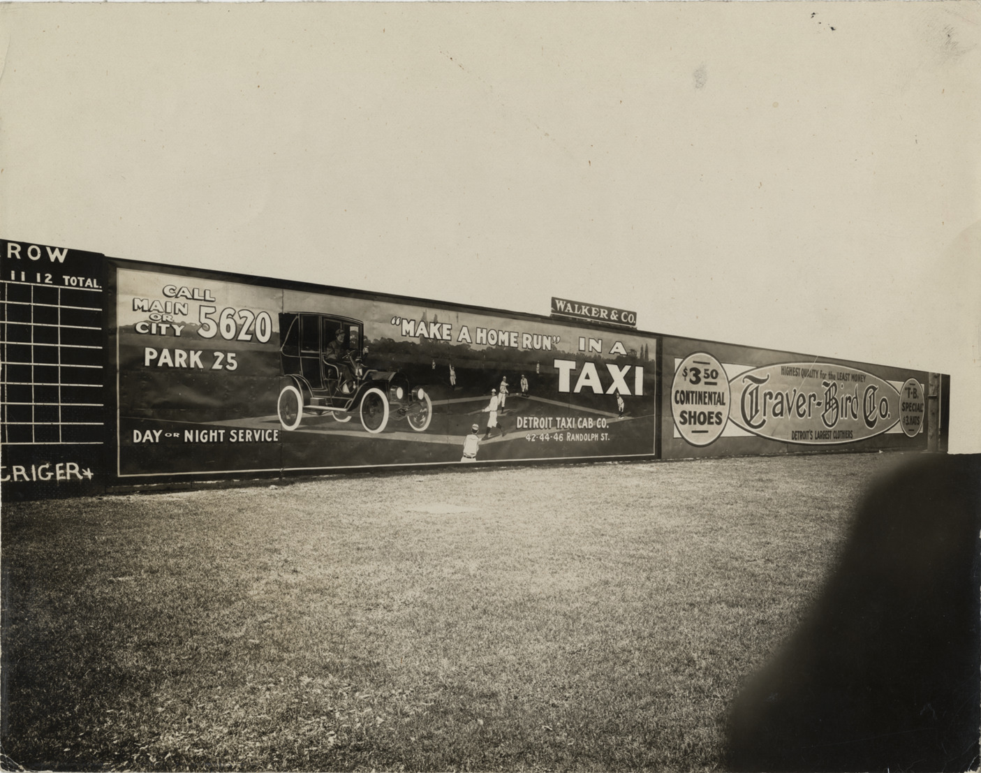 View of Walker & Co. billboards at Bennett Park ballpark; billboards advertise Detroit Taxi Cab Co. and Traver-Bird Co. Advertisements read: "Make a home run in a taxi. Detroit Taxi Cab Co., 42-44-46 Randolph St., call Main or City 5620, Park 25, day or night service. Traver-Bird Co., $3.50 continental shoes, Detroit's largest clothiers, highest quality for the least money, T.-B. special $3 hats." Scoreboard partially visible on left. Stamped on back: "The Manning Studio, 96 Broadway, Detroit." Handwritten on back: "Most likely Bennett Field."