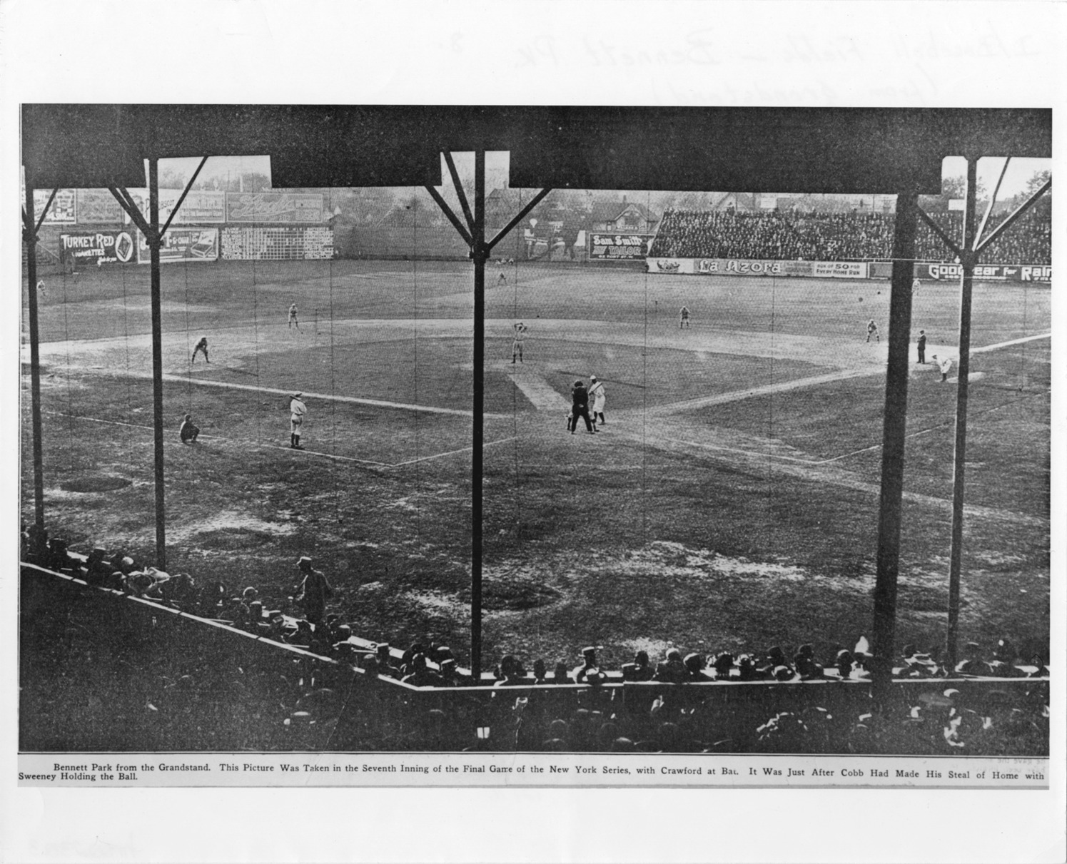 View of baseball game at Bennett Park ballpark; crowds seated in grandstand in foreground. Crowd fills bleachers in background. Caption under photograph: "Bennett Park from the grandstand. This picture was taken in the seventh inning of the final game of the New York series, with Crawford at bat. It was just after Cobb had made his steal of home with Sweeney holding the ball."