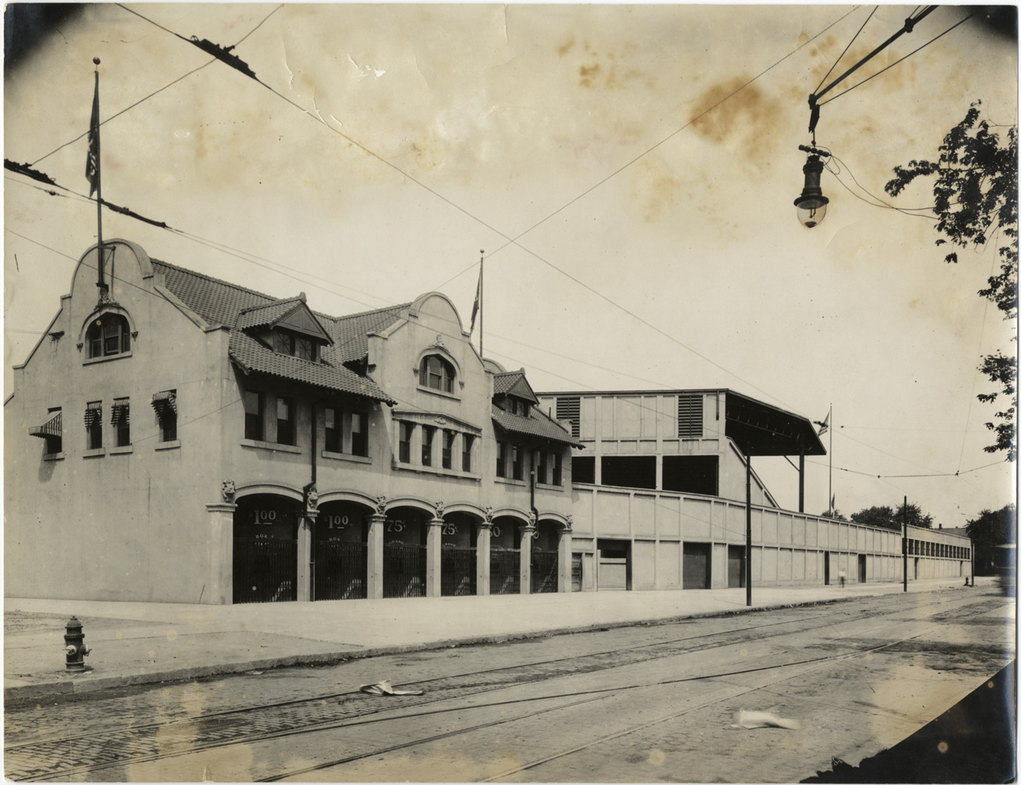 View of entrance to Navin Field ballpark; Mission style stucco building has arched colonnade and tile roof. Gates enclose each arch; signed inside arch: "$1.00, 75 [cents], 50 [cents]." Side of grandstand is visible on right. Handwritten on back: "Navin Field, c.1912, looking north on Trumbull."