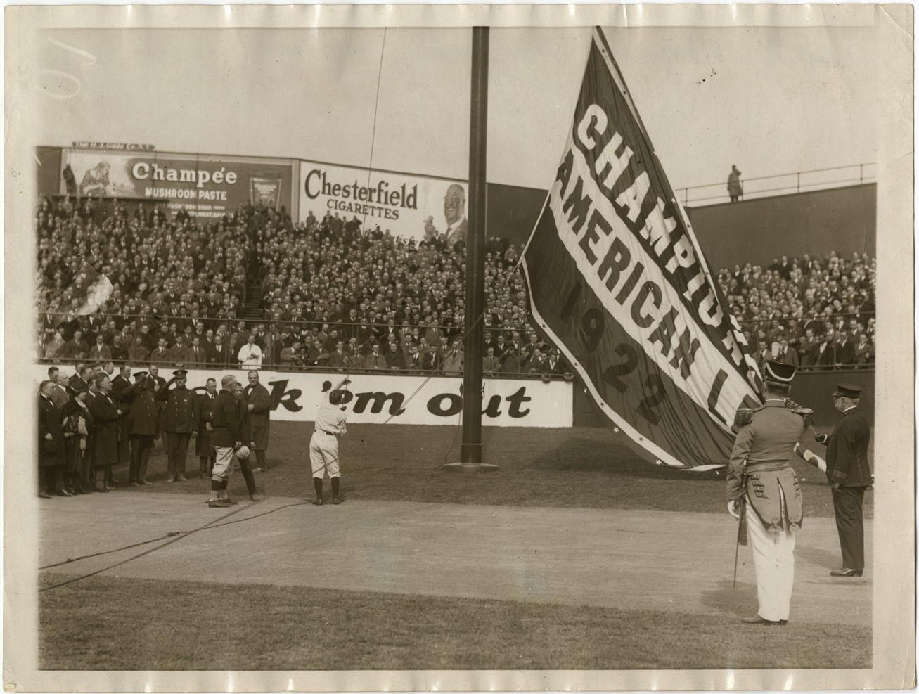 View of baseball player raising championship flag at opening day ceremonies before baseball game at Yankee Stadium. Group of dignitaries stand near flagpole; band conductor and man in military uniform stand at right. Spectators stand in bleachers; billboards advertising Champee mushroom paste and Chesterfield cigarettes. Flag reads in part: "Champion ... American Le ... 1922." Stamped on back: "Photo by Pacific & Atlantic Photos, Inc. 25 Park Place, New York City." Handwritten on back: "Opening day at Yankee Stadium, NYC, 1923, 1st game at stadium."