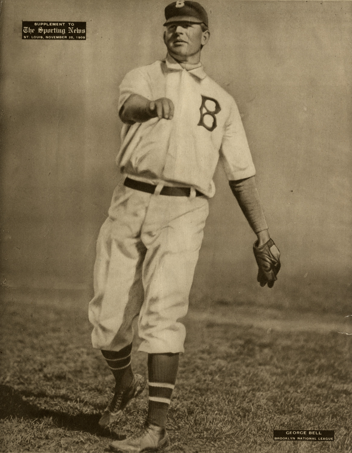 Favorite this☆ George Bell Description: Brooklyn Superbas pitcher George Bell on field pitching. Printed on front: "Supplement to the Sporting News, St. Louis, November 25, 1909. George Bell. Brooklyn National League." Details Resource ID: hr002423 Subject: Bell, George (George Glenn), 1874-1941 Pitchers (Baseball)--New York (State)--New York Baseball teams--New York (State)--New York Photographic prints Date Issued: 1909 Format: 1 photographic print ; 10.25 x 8 in. Member of: Ernie Harwell Sports Collection Filing Location: Photographs-Biography-Bell, George Rights: Physical rights are retained by DPL. Copyright is retained in accordance with U.S. copyright laws.