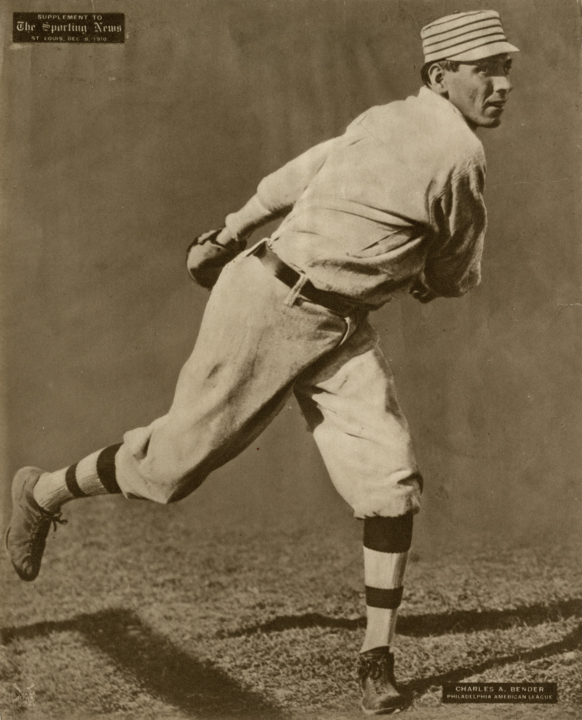Philadelphia Athletics pitcher Chief Bender pitching. Printed on front: "Supplement to the Sporting News, St. Louis, Dec. 8, 1910. Charles A. Bender. Philadelphia American League."