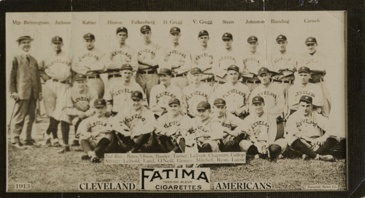 Group portrait of the 1913 Cleveland Naps. Fatima Team Cards (T200). Printed on front: "1913 Cleveland Americans. Fatima Turkish blend cigarettes. [Copyright] Pictorial News Co. Mgr. Birmingham, Jackson, Kahler, Hinton, Falkenberg, D. Gregg, V. Gregg, Steen, Johnston, Blanding, Carisch. 2nd row: Bates, Olson, Bassler, Turner, Lelivelt, Chapman, Cullop. Sitting: Leibold, Land, O'Neill, Grancy, Mitchell, Ryan, Lajoie." Printed on back: "Fatima Turkish blend cigarettes. 'No gold tips but finest quality.' Special offer. On receipt of 40 'Fatima' cigarette coupons, we will send you an enlarged copy (size 13 x 21) of this picture (without advertising) or of any other picture in this series (National League and American League teams). This picture is mounted, and ready for framing. Write plainly your name and address, stating picture desired. Premium Department, Liggett & Myers Tob. Co., 7th Ave. & 16th St., New York City, N.Y. Factory no. 42, fourth district of N.C."