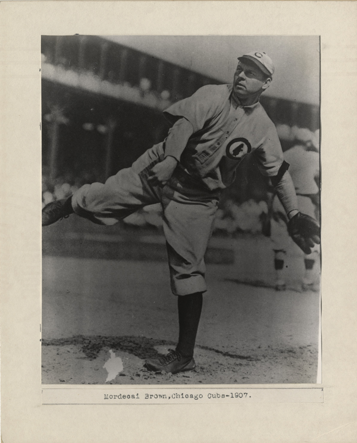 Chicago Cubs pitcher Mordecai Brown on field pitching, weight on left foot. Typed on label on mat front: "Mordecai Brown, Chicago Cubs - 1907."