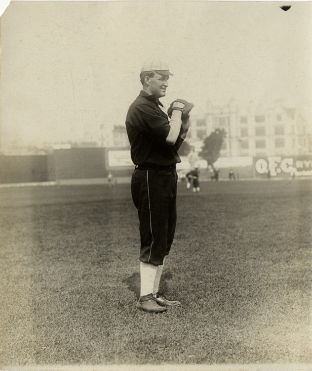 Bill Burns pitching on field. Buildings behind. Handwritten on back: "Burns (White Sox)." Stamped on duplicate back: "Charles M. Conlon, 216 W. 111th St., New York."