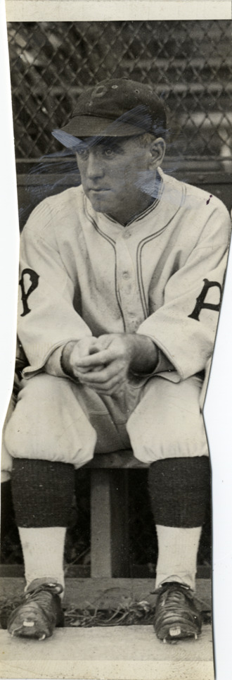 Pittsburgh Pirates manager Donie Bush sitting on bench. Stamped on back: "Oct. 19 1927." Handwritten on back: "Donie Bush. Pittsburgh manager."