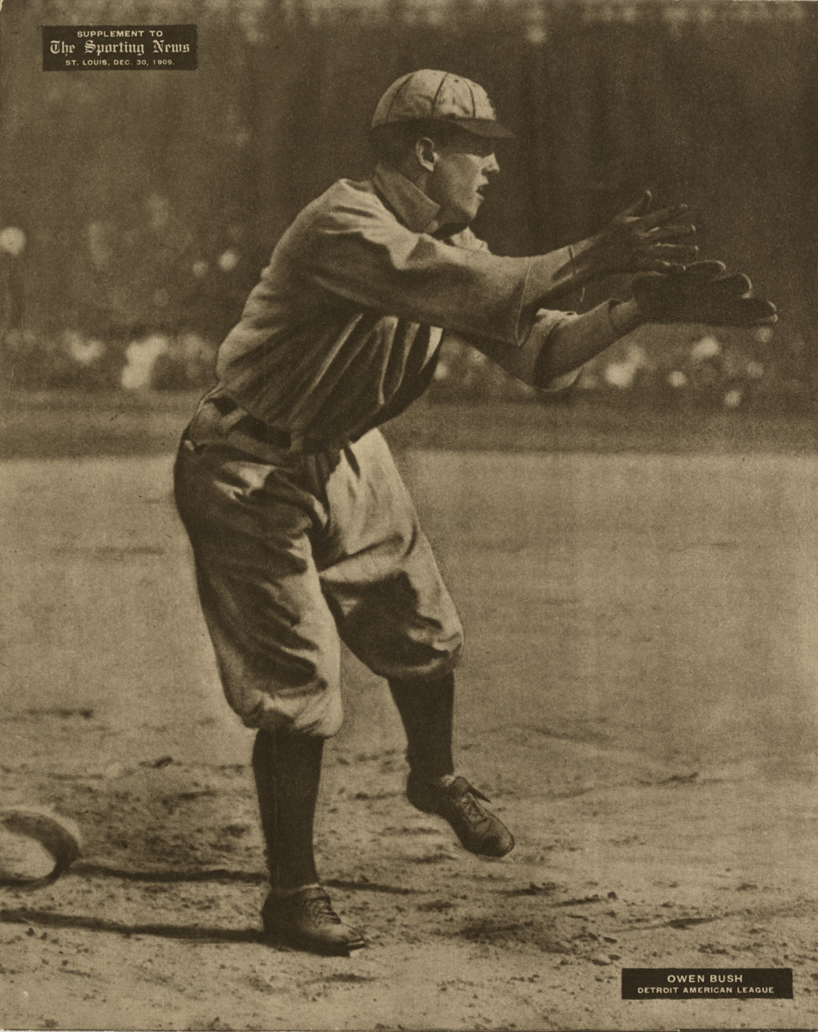 Favorite this☆ Donie Bush Description: Detroit Tigers shortstop Donie Bush, reaching for catch. Printed on front: "Supplement to the Sporting News, St. Louis, Dec. 30, 1909. Owen Bush. Detroit American League." Details Resource ID: hr002556 Subject: Bush, Donie (Owen Joseph), 1887-1972 Baseball players--Michigan--Detroit Detroit Tigers (Baseball team) Photographic prints Date Issued: 1909 Format: 1 photographic print ; 10 x 8 in. Member of: Ernie Harwell Sports Collection Filing Location: Photographs-Biography-Bush, Donie Rights: Physical rights are retained by DPL. Copyright is retained in accordance with U.S. copyright laws.