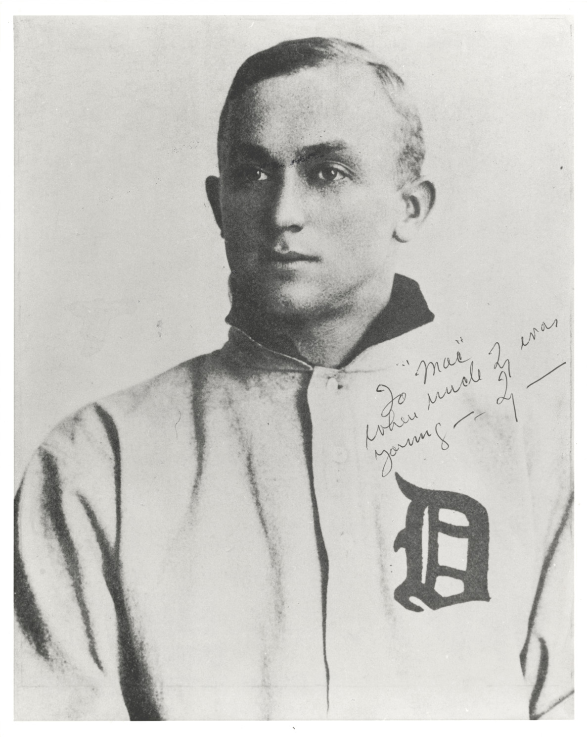Favorite this☆ Ty Cobb Description: Portrait of Ty Cobb, baseball player for the Detroit Tigers. Autograph on front: "To 'Mac', when Uncle Ty was young. Ty." Label on back: "Cobb in 1906, his first full season in the American League. National Baseball Hall of Fame and Museum." Details Resource ID: hr002636 Subject: Cobb, Ty, 1886-1961 Cobb, Ty, 1886-1961--Autographs Baseball players--Michigan--Detroit Detroit Tigers (Baseball team) Photographic prints Date Issued: 1906 Format: 1 photographic print ; 10 x 8 in. Member of: Ernie Harwell Sports Collection Filing Location: Photographs-Biography-Cobb, Tyrus (Ty) Rights: Physical rights are retained by DPL. Copyright is retained in accordance with U.S. copyright laws.