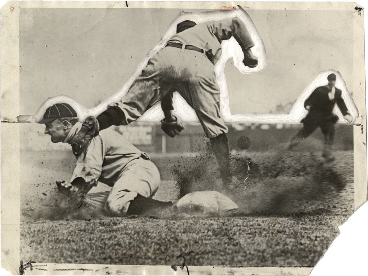 View of Detroit Tigers baseball player Ty Cobb, being tagged by Jimmy Austin of the New York Highlanders as he slides into base. Umpire stands in background. Stamped on back: "The Detroit News scraparium." Handwritten on back: "1909, sliding into 3rd base under Jimmy Austin."