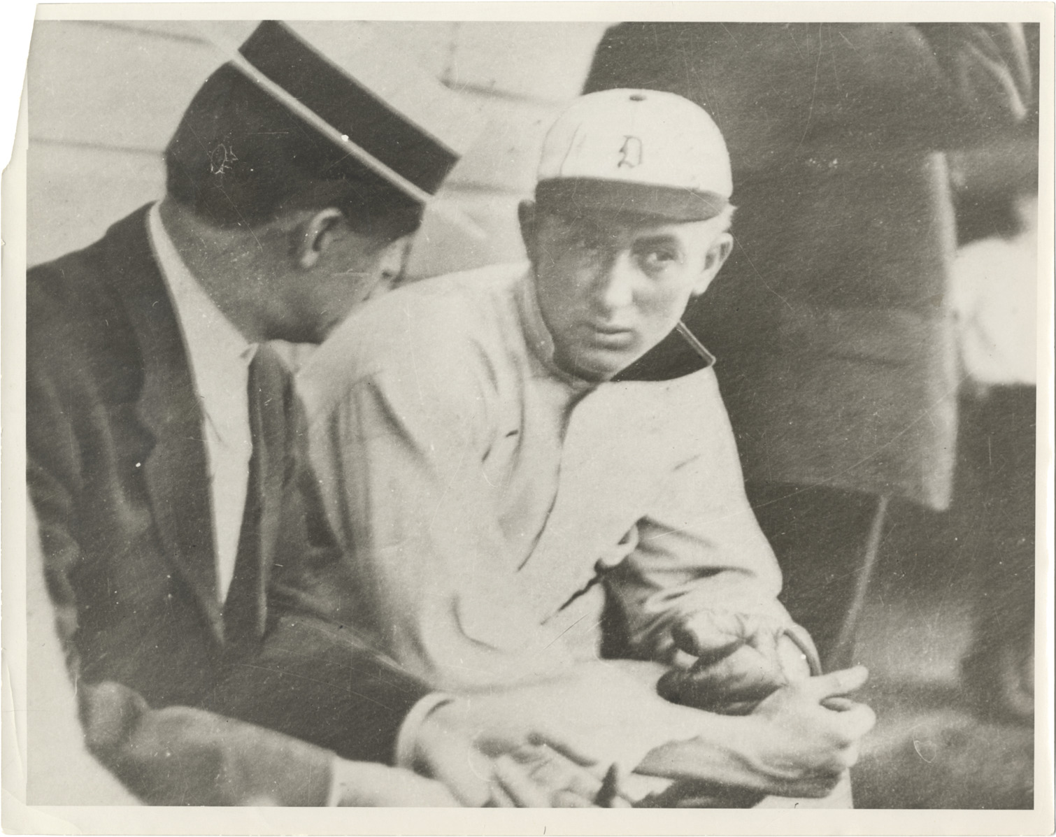 Favorite this☆ Ty Cobb seated with Bill Armour Description: View of Ty Cobb, baseball player for the Detroit Tigers, seated on bench with manager Bill Armour. Handwritten on back: "Bill Armour, mgr & Ty Cobb, 1st day he played at Det." Details Resource ID: hr002657 Creator: Kuenzel, William A., 1884-1964 Subject: Cobb, Ty, 1886-1961 Armour, Bill (William Reginald), 1869-1922 Baseball players--Michigan--Detroit Baseball managers--Michigan--Detroit Detroit Tigers (Baseball team) Photographers--Michigan--Detroit Photographic prints Date Issued: 1905 Format: 1 photographic print ; 8 x 10 in. Member of: Ernie Harwell Sports Collection Filing Location: Photographs-Biography-Cobb, Tyrus (Ty) Rights: Physical rights are retained by DPL. Copyright is retained in accordance with U.S. copyright laws.