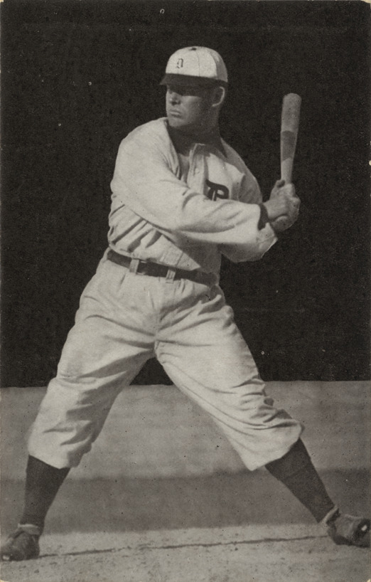 Portrait of Sam Crawford, baseball player for the Detroit Tigers, holding a baseball bat. Printed on back: "Samuel S. Crawford, center fielder of the Detroit Club and champion slugger of the American League, played his first professional ball in the Canadian League in 1898. He came to Detroit from Cincinnati during the player war in 1903. As a distance hitter and sure fielder he has no peer. Copyrighted and published by A.C. Dietsche, Detroit, Mich., 1907."