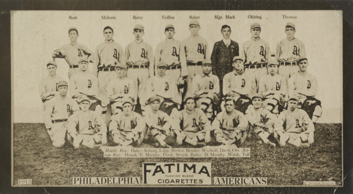 Group portrait of the 1913 Philadelphia Athletics. Fatima Team Cards (T200). Printed on front: "1913 Philadelphia Americans. Fatima Turkish blend cigarettes. [Copyright] Pictorial News Co. Bush, McInnis, Barry, Collins, Baker, mgr. Mack, Oldring, Thomas. Middle row: Daley, Schang, Lapp, Brown, Bender, Wyckoff, Davis, Orr. Bottom row: Houck, E. Murphy, Plank, Strunk, Bailey, D. Murphy, Walsh, Taff." Printed on back: "Fatima Turkish blend cigarettes. 'No gold tips but finest quality.' Special offer. On receipt of 40 'Fatima' cigarette coupons, we will send you an enlarged copy (size 13 x 21) of this picture (without advertising) or of any other picture in this series (National League and American League teams). This picture is mounted, and ready for framing. Write plainly your name and address, stating picture desired. Premium Department, Liggett & Myers Tob. Co., 7th Ave. & 16th St., New York City, N.Y. Factory no. 42, fourth district."
