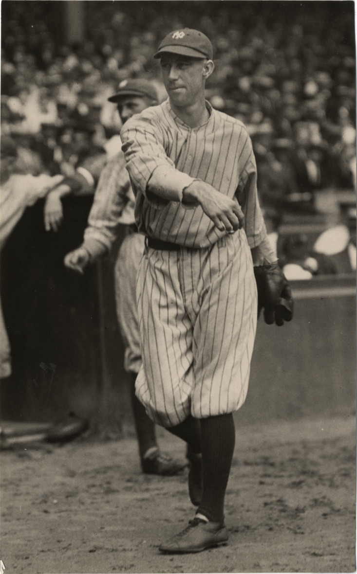 Joe Dugan, New York Yankees third baseman, throwing on field. Handwritten on back: "Dugan (Yankees)."