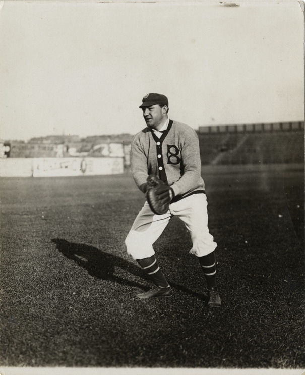Joe Dunn, Brooklyn Superbas catcher, standing on field. Handwritten on back: "Dunn, Brook." Handwritten on duplicate back: "Joe Dunn, Brooklyn, 1909."