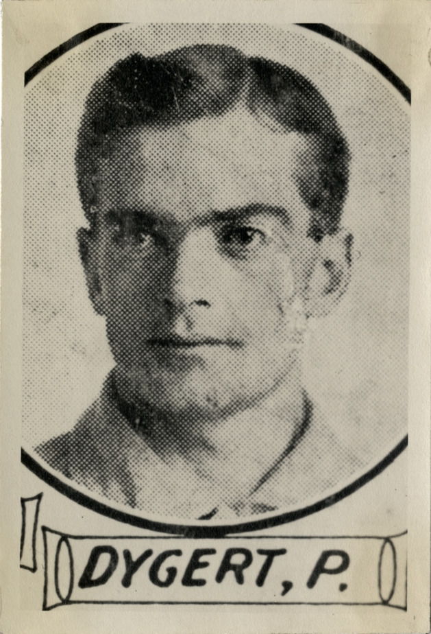 Close-up portrait of Jimmy Dygert, Philadelphia Athletics pitcher. Printed on front: "Dygert, P. [pitcher]." Stamped on back: "Reproduced by Geo. Burke, 847 Belmont Ave., Chicago, Ill." Handwritten on back: "Athletics. 1910."