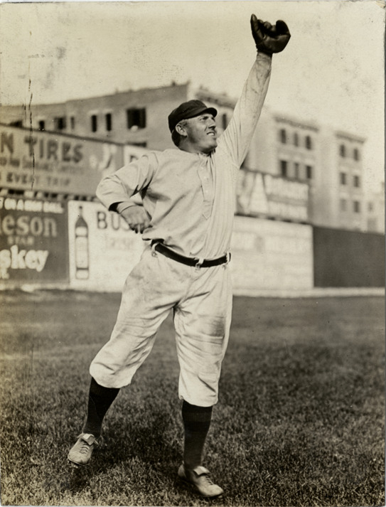 Clyde Engle, New York Highlanders baseball player, reaching to catch high ball. Buildings with signs in background. Stamped on back: "Charles M. Conlon, 216 W. 111th St., New York." Handwritten on back: "Clyde Engle (N.Y. Am.) 1909."