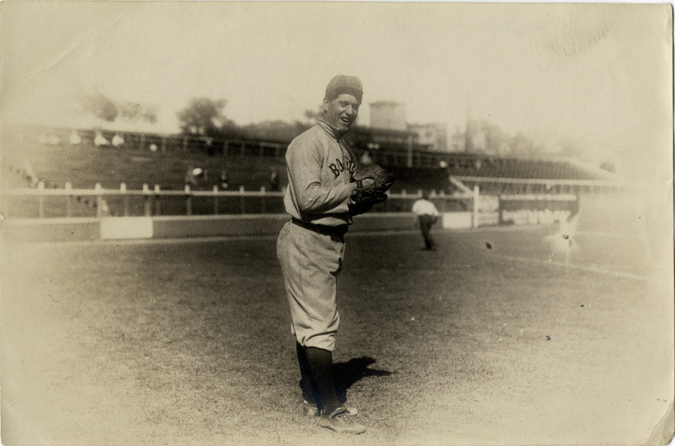 Patsy Flaherty, Boston Doves pitcher, standing on field. Handwritten on back: "Flaherty. Boston Nat."