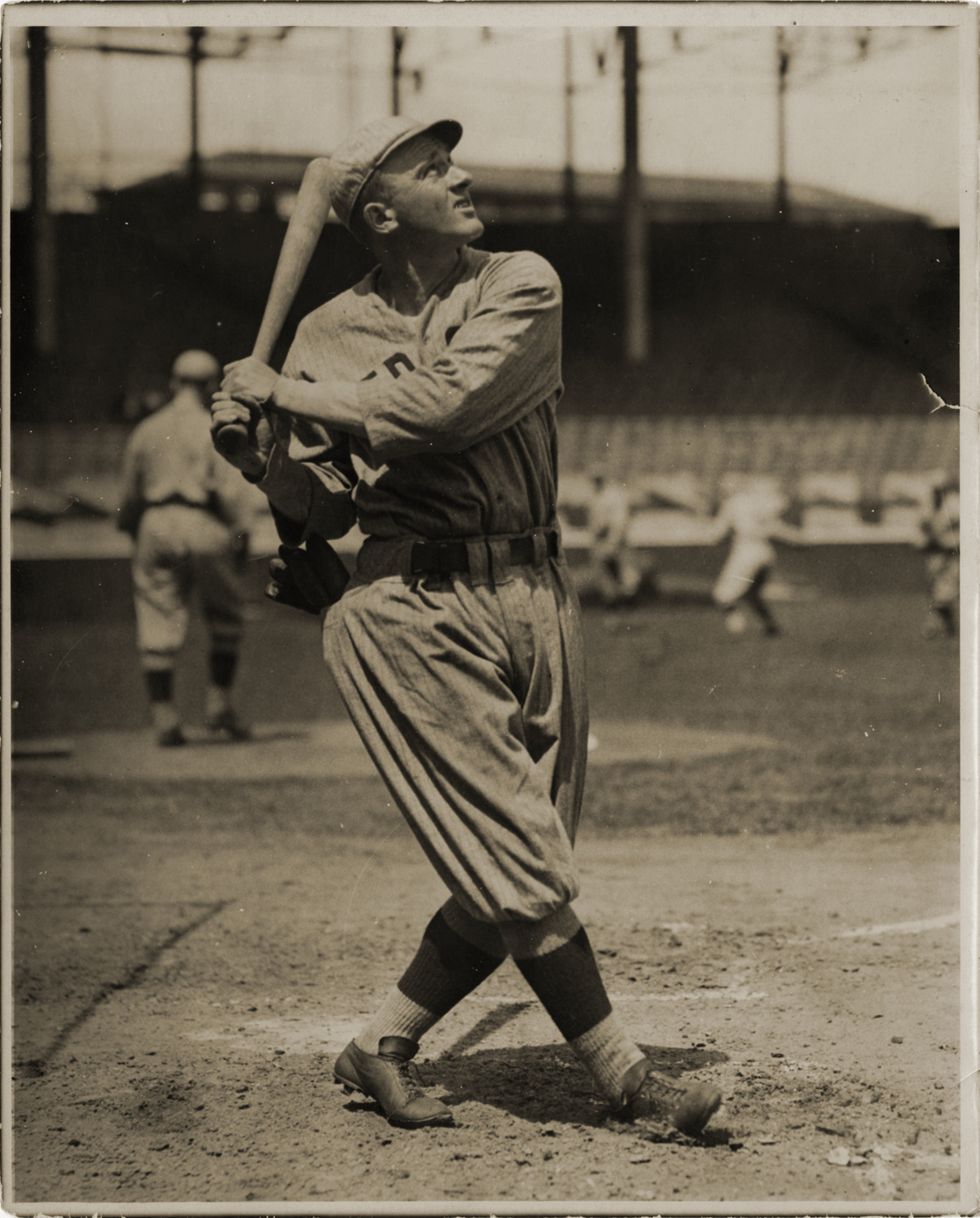 Larry Gardner, Boston Red Sox third baseman, swinging bat on field. Handwritten on back: "Lary [sic] Gardner (Red Sox) Conlon photo." Stamped on duplicate back: "Charles M. Conlon, Evening Telegram, New York." Handwritten on duplicate back: "Larry Gardner, Wil. Red Sox. 1910."