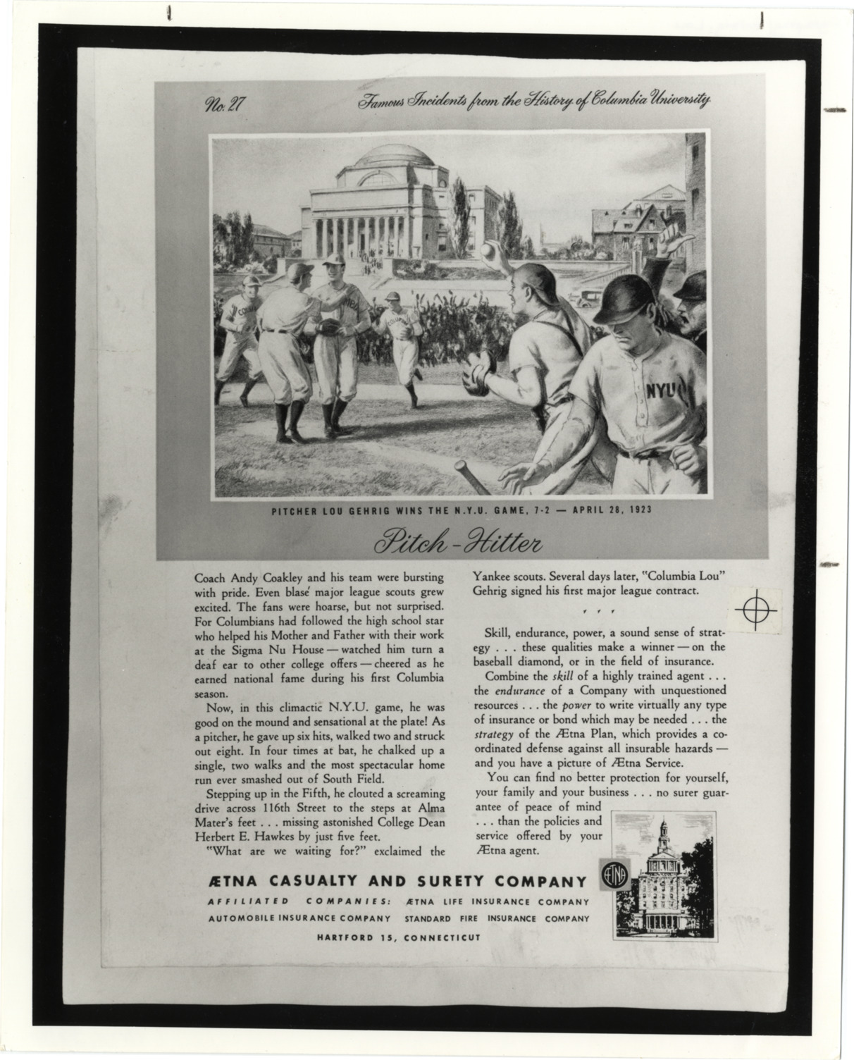 Print ad for Aetna Casualty and Surety Company featuring performance by Lou Gehrig in Columbia University game against NYU. Printed on front: "No. 27, Famous incidents from the history of Columbia University, pitcher Lou Gehrig wins the N.Y.U. game, 7-2, April 28, 1923. Pinch-hitter. Coach Andy Coakley ..."