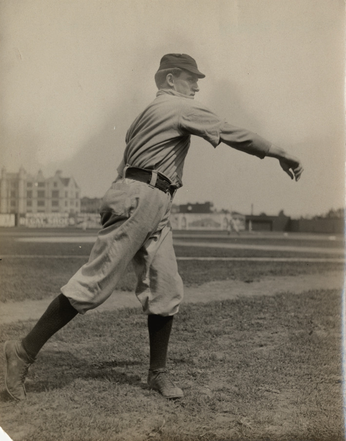 St. Louis Browns pitcher Fred Glade, pitching on field. Handwritten on back: "Glade (St. Louis)." Stamped on duplicate back: "Charles M. Conlon, 216 W. 111th St., New York." Handwritten on duplicate back: "Glade (St. L. Am.) and (N.Y. Am.)." Handwritten on duplicate back: "Fred M. Glade. Pitcher. St. Louis Amer. 1907."