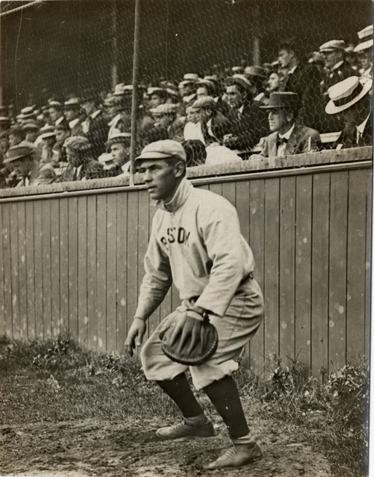 Boston Doves catcher Peaches Graham, in front of fans in stands. Handwritten on back: "Graham (Boston Nat.)"