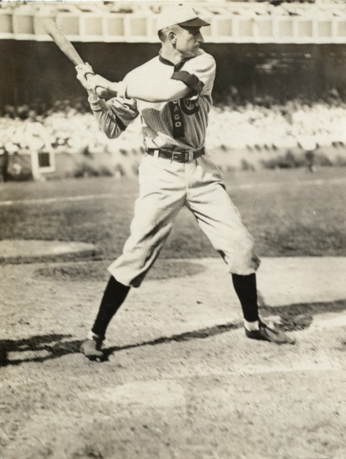Portrait of Solly Hofman, baseball player for the Chicago Cubs, at bat. Grandstand in background. Stamped on back: "[Ch]arles M. Conlon, [216 W.] 111th St., New York." Handwritten on back: "Hofman, Arthur F."