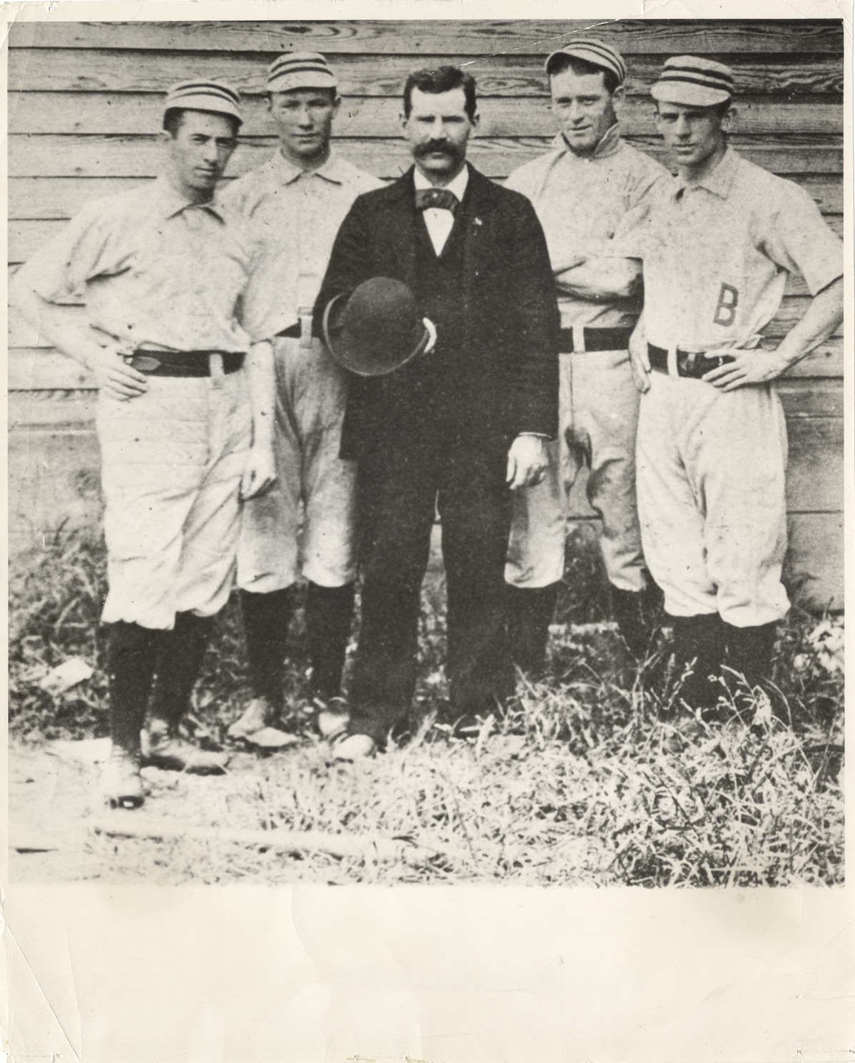 Group portrait of baseball players Hughie Jennings, Willie Keeler, Joe Kelley, John McGraw and groundskeeper Tom Murphy of the Baltimore Orioles. Handwritten on back: "The key men on the Baltimore Orioles were small as ballplayers go. As can be seen here, none of them towered over the pint-sized Keeler who is on the extreme left. The other three players (from left to right) are Hughey Jennings, Joe Kelly, and John McGraw, all of them around five feet seven. In the middle stands Tom Murphy, the grounds keeper. Year 1895."
