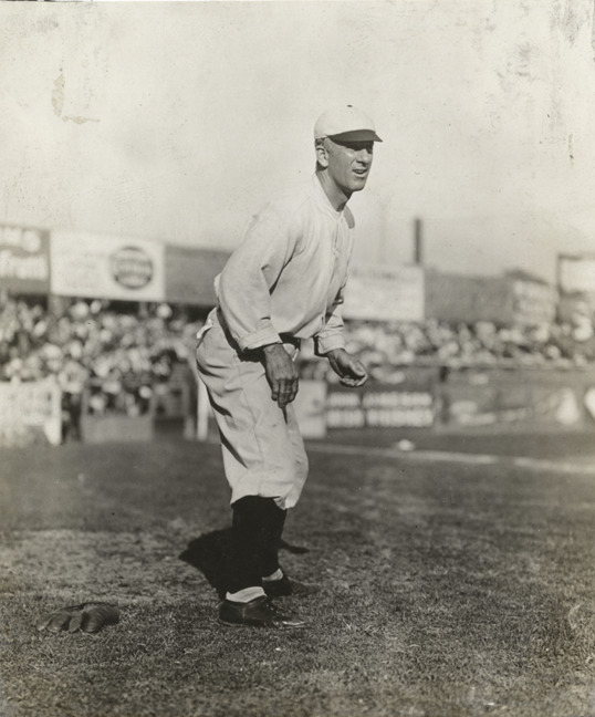 Portrait of Arlie Latham, baseball player for the New York Giants, reaching for a ground ball. Handwritten on back: "Arlie Latham, N.Y. Nat., 1910 [sic]."