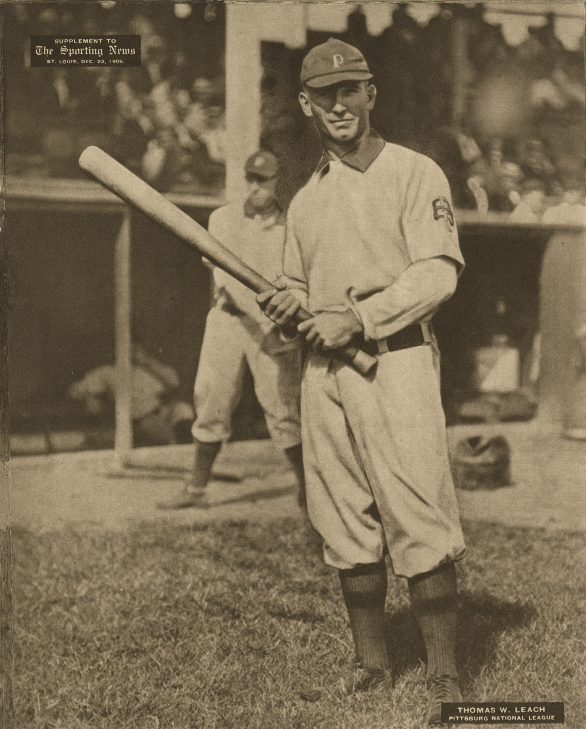 Portrait of Tommy Leach, baseball player for the Pittsburgh Pirates, holding a baseball bat. Another player stands in background. Printed on front: "Thomas W. Leach, Pittsburgh National League. Supplement to the Sporting News, St. Louis, Dec. 23, 1909."