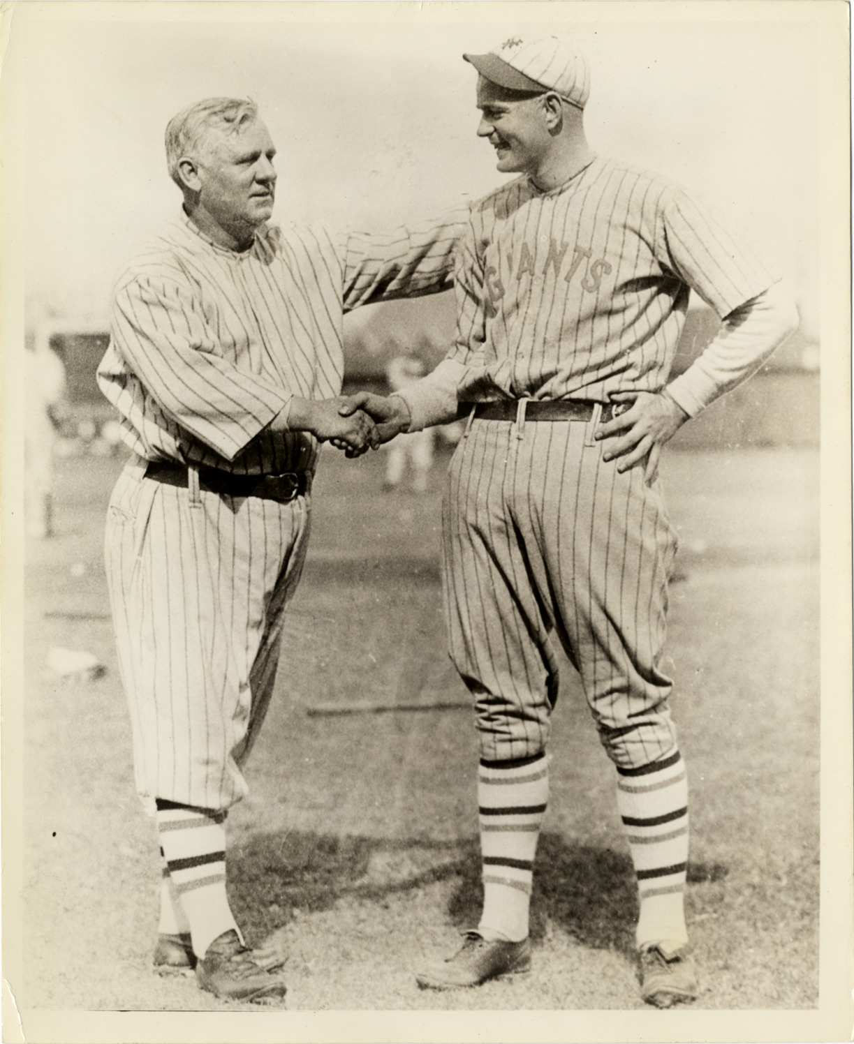 Favorite this☆ John McGraw and Jimmy O'Connell Description: New York Giants manager John McGraw shaking hands with Jimmy O'Connell on field. Handwritten on back: "McGraw. O'Connell. San Antonio. 1923." Details Resource ID: hr003358 Subject: McGraw, John Joseph, 1873-1934 O'Connell, Jimmy (James Joseph), 1901-1976 Baseball managers--New York (State)--New York New York Giants (Baseball team) Photographic prints Date Issued: 1923 Format: 1 photographic print ; 10 x 8.25 in. Member of: Ernie Harwell Sports Collection Filing Location: Photographs-Biography-McGraw, John Rights: Physical rights are retained by DPL. Copyright is retained in accordance with U.S. copyright laws.