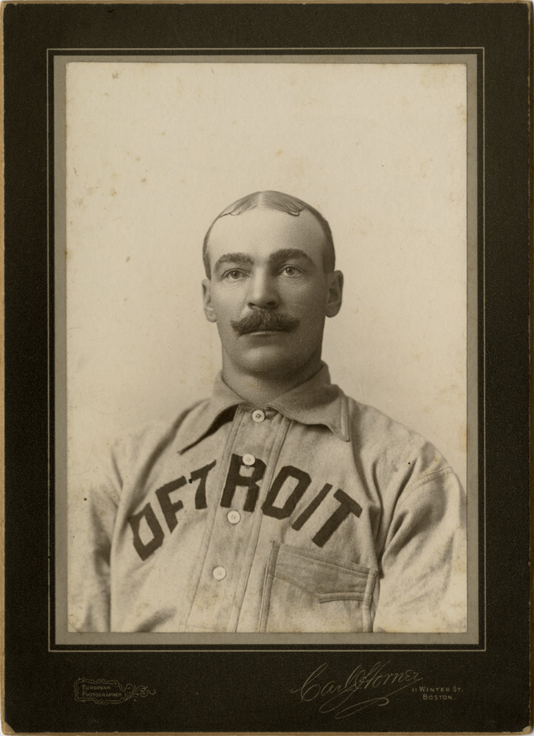 Studio portrait of Detroit Tigers catcher Deacon McGuire. Printed on mat front: "European photographer. Carl Horner, 11 Winter St., Boston." Handwritten on back: "Jim McGuire. C. '03." Stamped on duplicate back: "Reproduced by Geo. Burke, 847 Belmont Ave., Chicago, Ill." Handwritten on duplicate back: "Jas. J. [sic] McGuire. 1902-03."