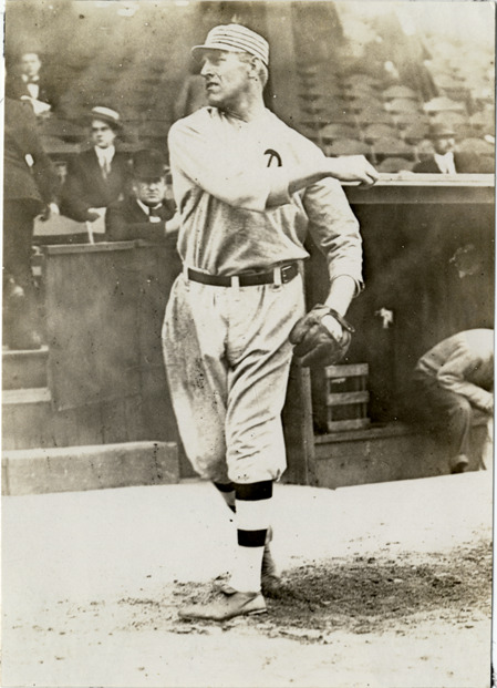 Philadelphia Athletics pitcher Cy Morgan pitching on field in front of stands and dugout. Stamped on back: "Charles M. Conlon, Evening Telegram, New York." Handwritten on back: "Morgan (Athletics). 1911."