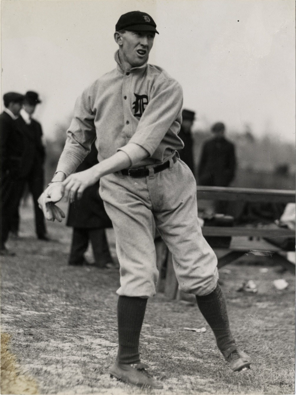 Detroit Tigers pitcher Red Oldham pitching on field. Handwritten on back: "John Oldham. Tigers. 1914-22."