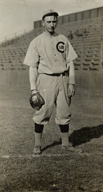 Chicago Cubs pitcher Jack Pfiester standing on field. Stamped on back: "[Charles] M. Conlon, [216 W.] 111th St., New York." Handwritten on back: "Pfiester, Jack."