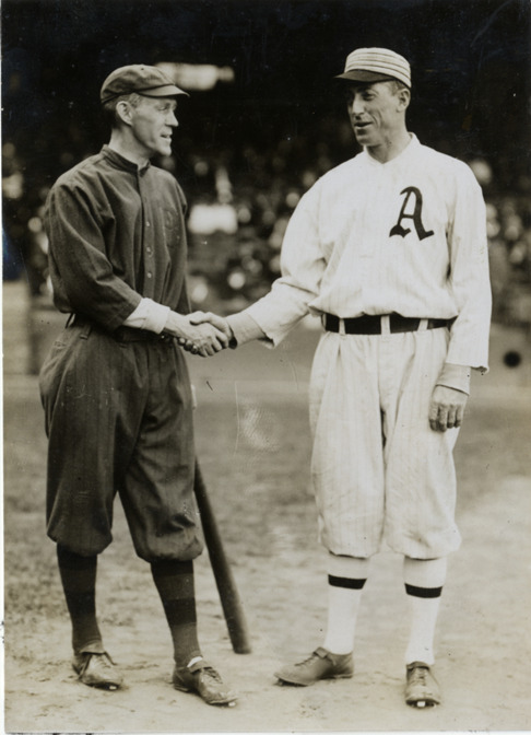 Philadelphia Athletics pitcher Eddie Plank shaking hands on field with Boston Braves outfielder Johnny Evers. Stamped on back: "Please credit the Bain News Service. From George Grantham Bain, 32 Union Square East, N.Y. This picture not to be resold; for your use only. Oct. 10, 1914." Handwritten on back: "Evers and Plank."