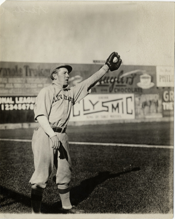 Cleveland Naps outfielder Duke Reilley posed catching on field. Stamped on back: "Charles M. Conlon, 216 W. 111th St., New York." Handwritten on back: "Reilly [sic] (Cleveland)." Handwritten on duplicate back: "Tom H. [sic] Reilly ['e' added]. Outfielder. Cleveland. 1909."