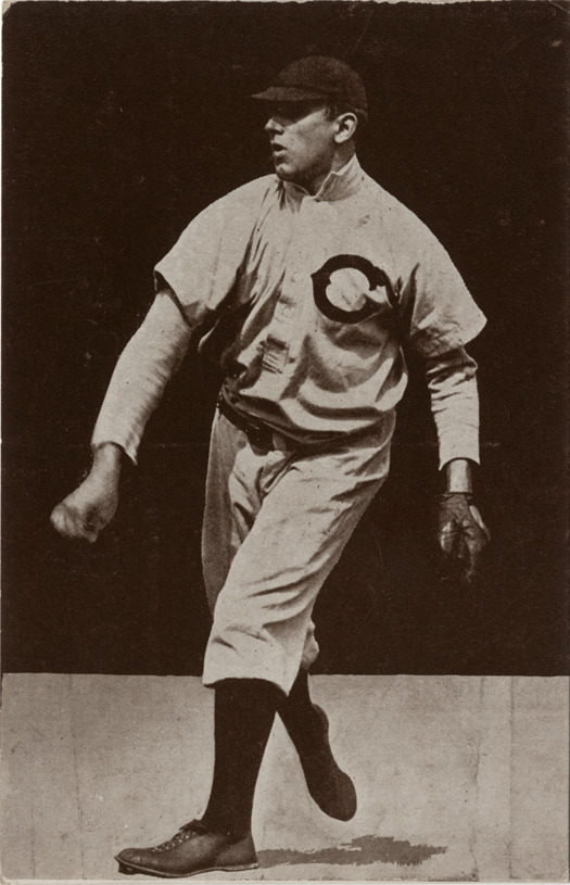 Chicago Cubs pitcher Ed Reulbach pitching on field. Printed on back: "Edw. M. Reulbach, pitcher, is a product of the sandlots of Detroit. He is a college graduate and was secured by Chicago from an independent league in Vermont. Last year he lead [sic] the National League pitchers and is at the top again this year. Reulbach was victorious in one of the games of the World's Series last year, letting the 'Sox' down with two hits by the score being 7 to 1. Copyrighted and published by A.C. Dietsche, Detroit, Mich., 1907." Handwritten on back: "Reulbach, Ed."