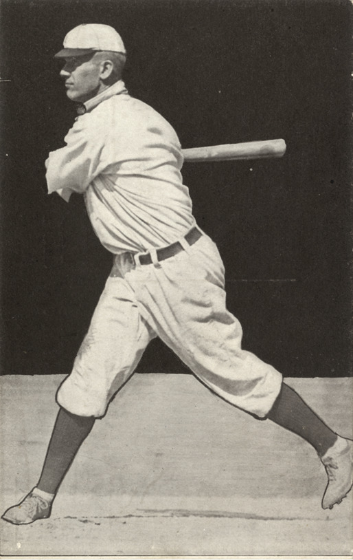 Portrait of Claude Rossman, baseball player for the Detroit Tigers, swinging a baseball bat. Printed on back: "Claud Rossman, first baseman of the Detroit Base Ball Club, started playing professionally in the Connecticut League in 1900. In 1906 he played at first base for Cleveland, and was sold to Detroit. His fielding and batting have been sensational. Rossman is a left-handed thrower and batter. Copyrighted and published by A.C. Dietsche, Detroit, Mich., 1907."