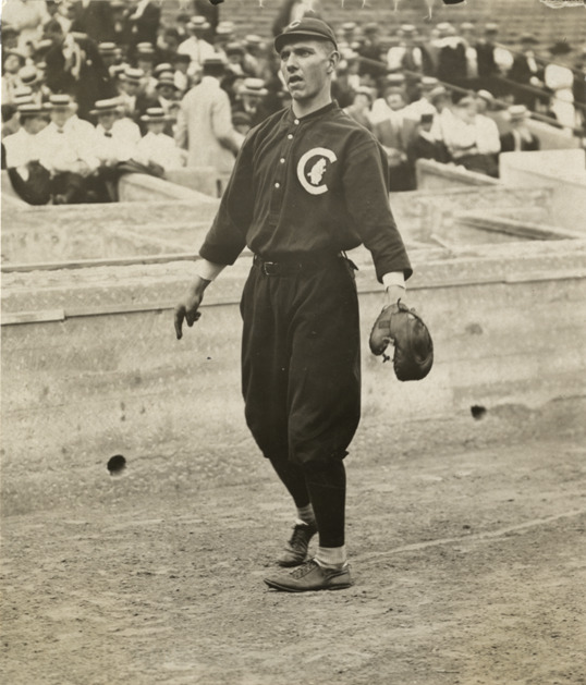 Portrait of Vic Saier, baseball player for the Chicago Cubs. Spectators seated in grandstand in background. Stamped on back: "Charles M. Conlon, Evening Telegram, New York." Handwritten on back: "Saier, Victor A. [sic], 1911."