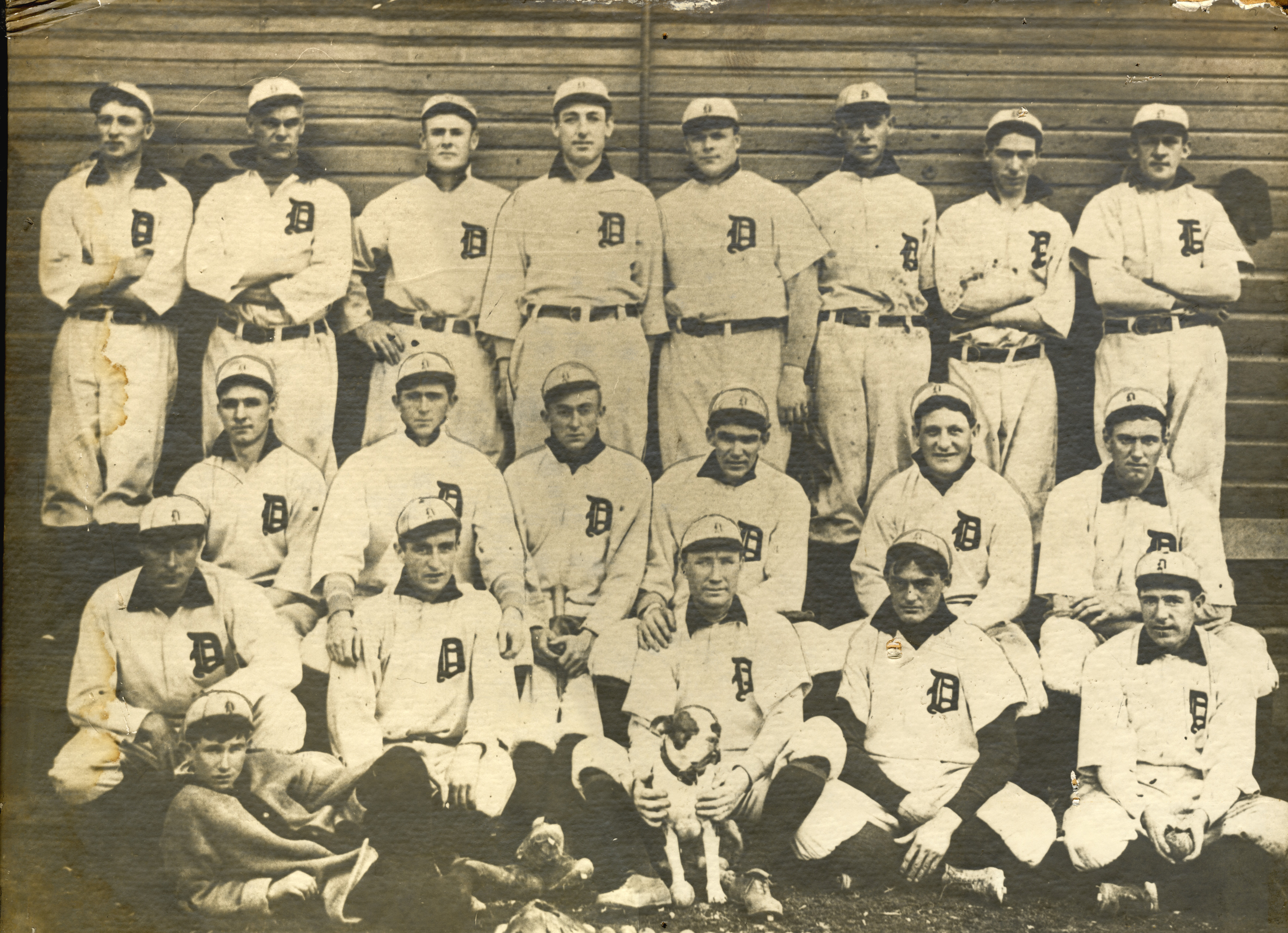 Favorite this☆ 1907 Detroit Tigers Description: Group portrait of 1907 Detroit Tigers. Player in first row poses with dog. Handwritten on back: "1907 pennant winners." Details Resource ID: hr003675 Subject: Detroit Tigers (Baseball team) Baseball players--Michigan--Detroit Photographic prints Date Issued: 1907 Format: 1 photographic print mounted on mat board ; 17 x 23 in. Member of: Ernie Harwell Sports Collection Filing Location: Photographs-Oversize Rights: Physical rights are retained by DPL. Copyright is retained in accordance with U.S. copyright laws.