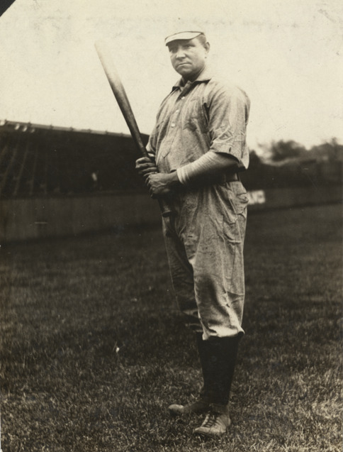 Portrait of Socks Seybold, baseball player for the Philadelphia Athletics, holding a baseball bat. Handwritten on back: "Socks Seybold, 1904."