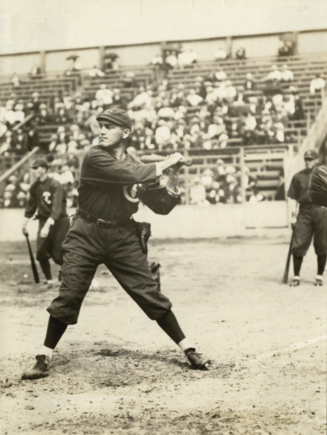 Portrait of Jimmy Sheckard, baseball player for the Chicago Cubs, swinging a baseball bat. Stamped on back: "Charles M. Conlon, Evening Telegram, New York." Handwritten on back: "Sheckard, James, Cubs, 1906."