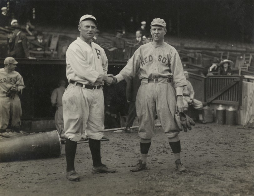 View of Tris Speaker, baseball player for the Boston Red Sox, shaking hands with Gavvy Cravath, baseball player for the Philadelphia Phillies, during the 1915 World Series. Spectators sit in grandstand in background. Handwritten on back: "Cravath and Speaker, World Series, 1915. Conlon."
