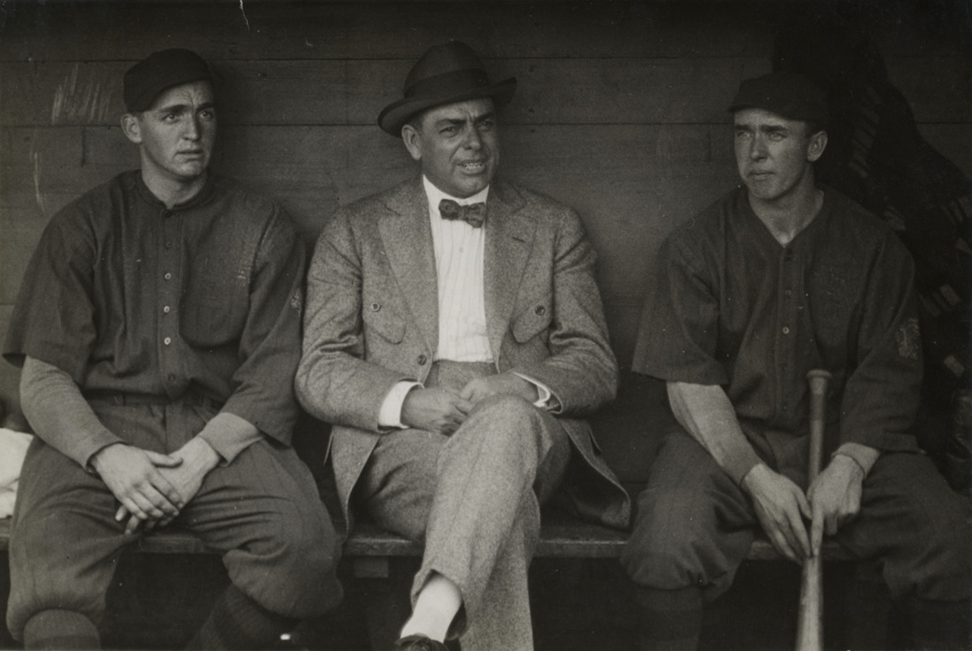Portrait of baseball manager George Stallings seated in dugout with Boston Braves baseball players Bill James and Dick Rudolph. Stamped on back: "Left to right, James, Stallings and Rudolph." Handwritten on back: "Left to right, James, Stallings and Rudolph, Braves, 1914."